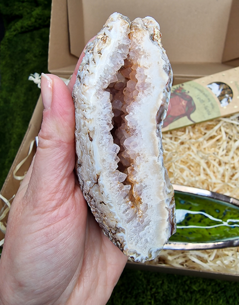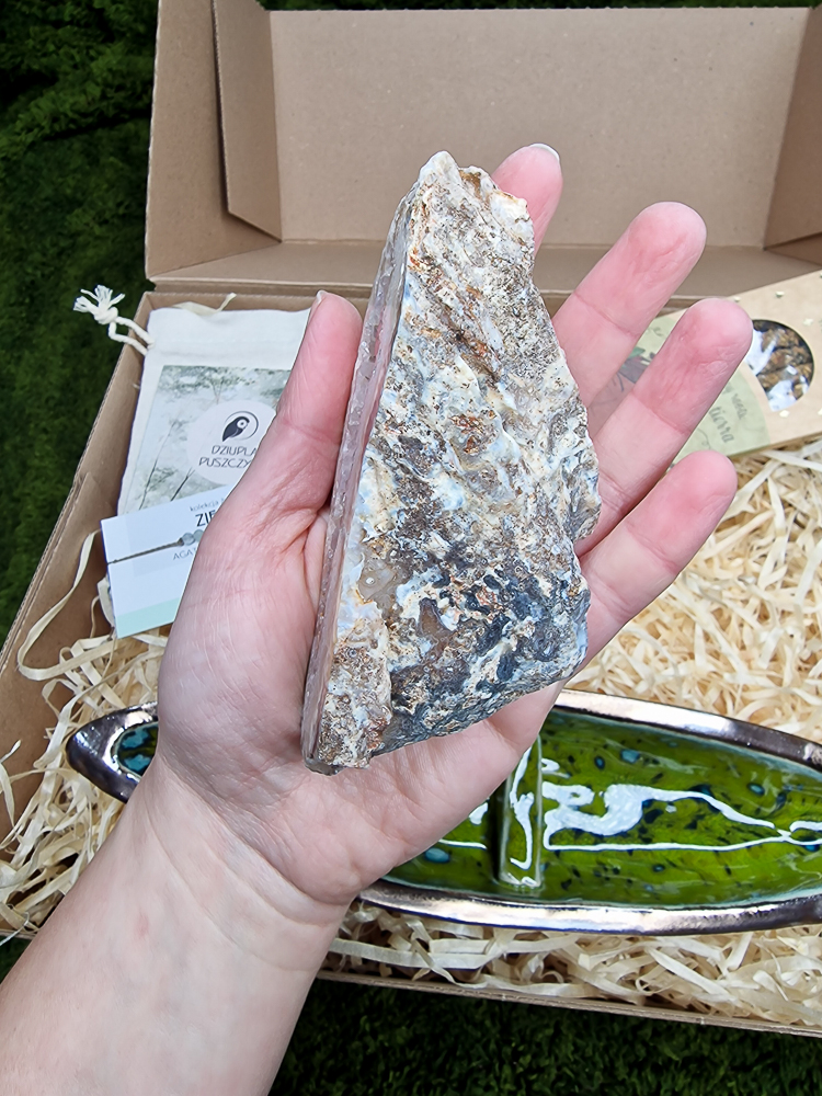 → zobacz podstawkę osobno - Geoda agatu z naturalnym kwarcem – wyjątkowa forma kamienia o uziemiającej i harmonizującej energii. Waga 302g, wymiary ok. 11x5x4.5cm, pochodzenie – Brazylia. Zapakowana w lniany woreczek.