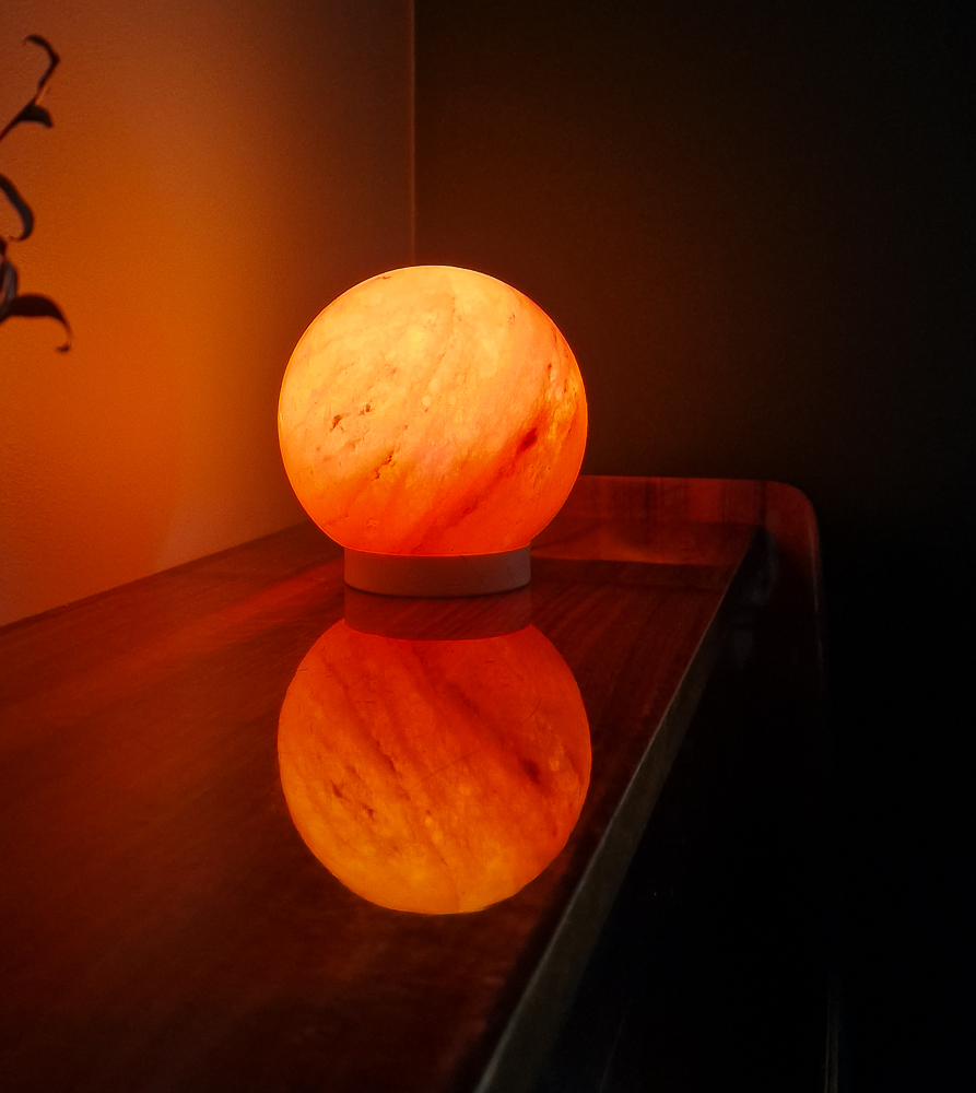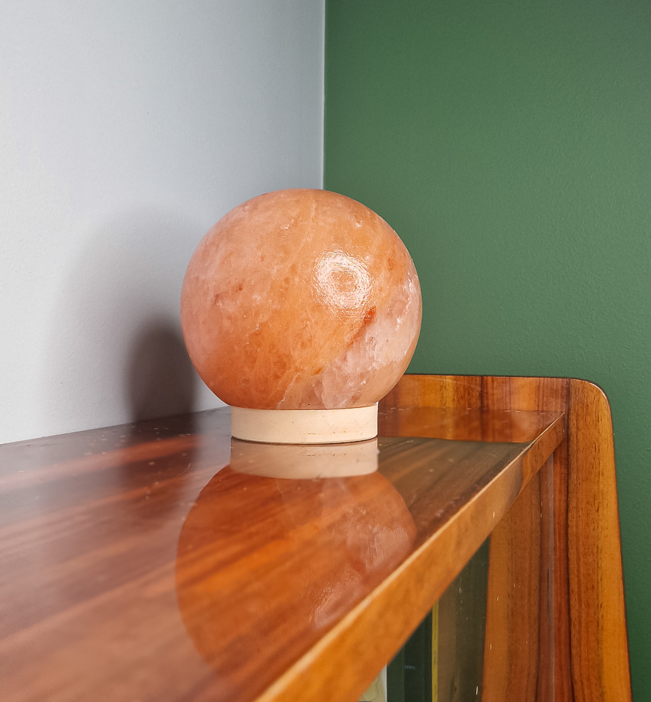 Piękna naturalna lampa sola, wykonana z polskiej soli. Każda kula jest wyjątkowa, z własnym rysunkiem kryształów i smugami w odcieniach różu, brzoskwini i ciepłego koralu.
