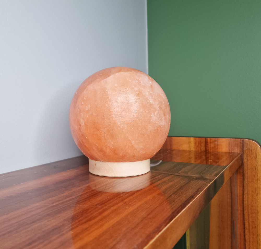 Oszlifowana i wypolerowana kula soli osadzona jest na stabilnej drewnianej podstawce.