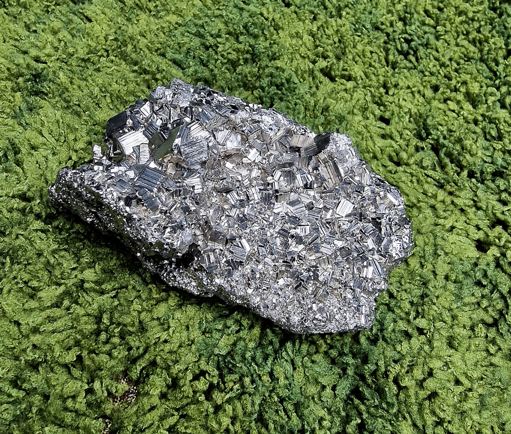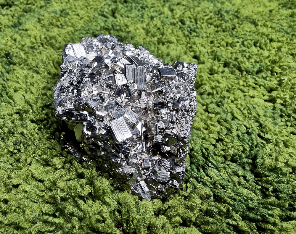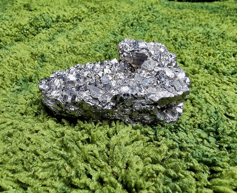 Ten naturalny piryt z Brazylii to bardzo efektowny klaster o intensywnym metalicznym połysku. Widoczne są liczne, dobrze wykształcone kryształy o sześciennej formie, charakterystycznej dla pirytów.