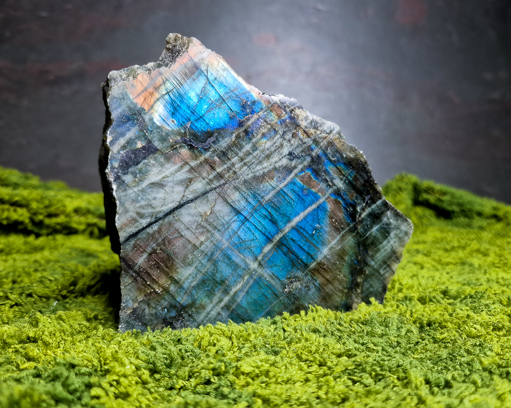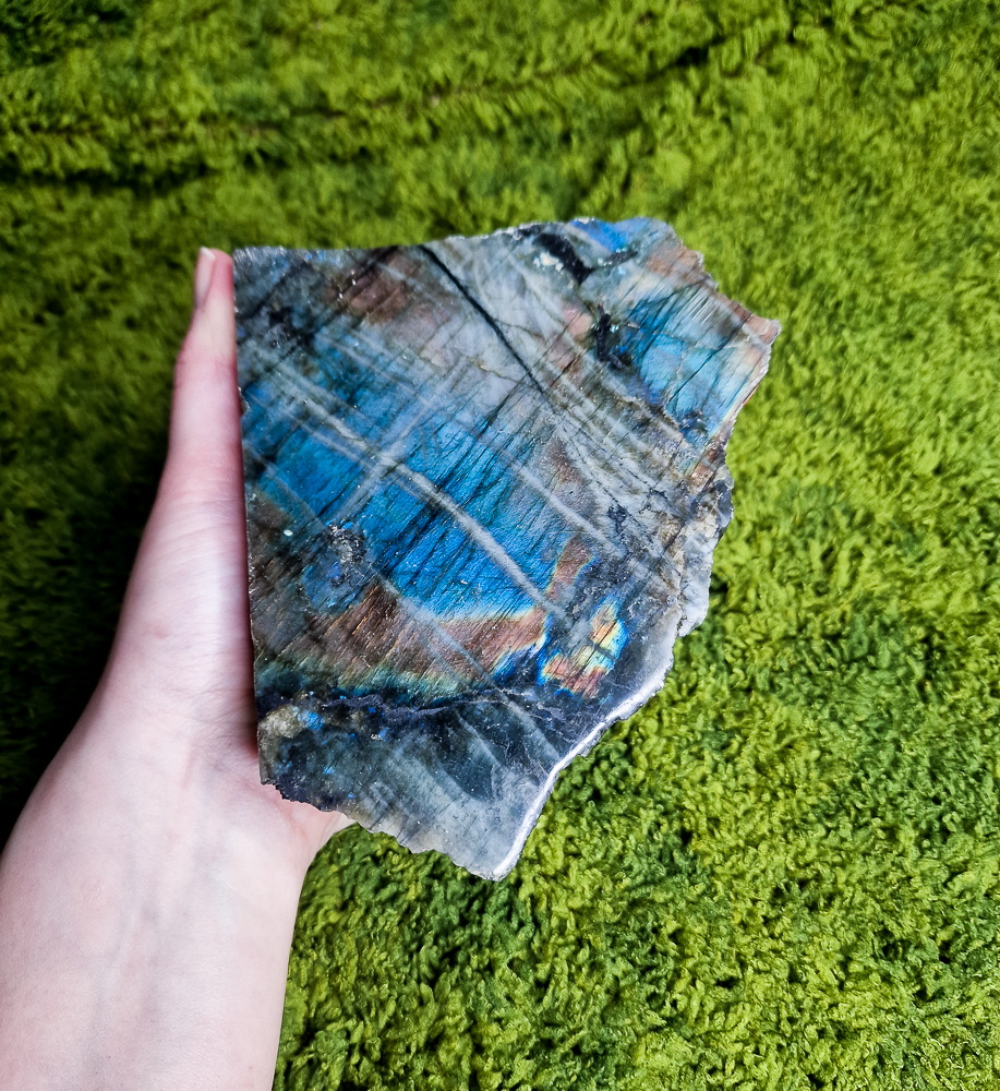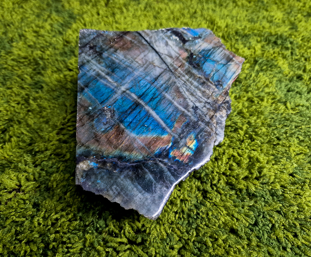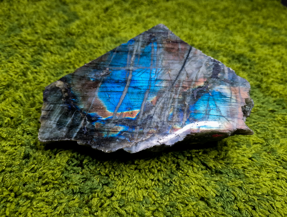 Przepiękny, duży labradoryt jednostronnie oszlifowany, stabilnie stojący.