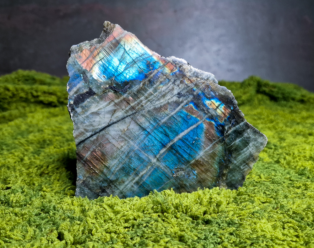Naturalna struktura kamienia w połączeniu z intensywną, niebiesko-złotą labradoryzacją sprawia, że jest to prawdziwe dzieło natury.