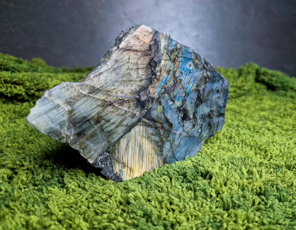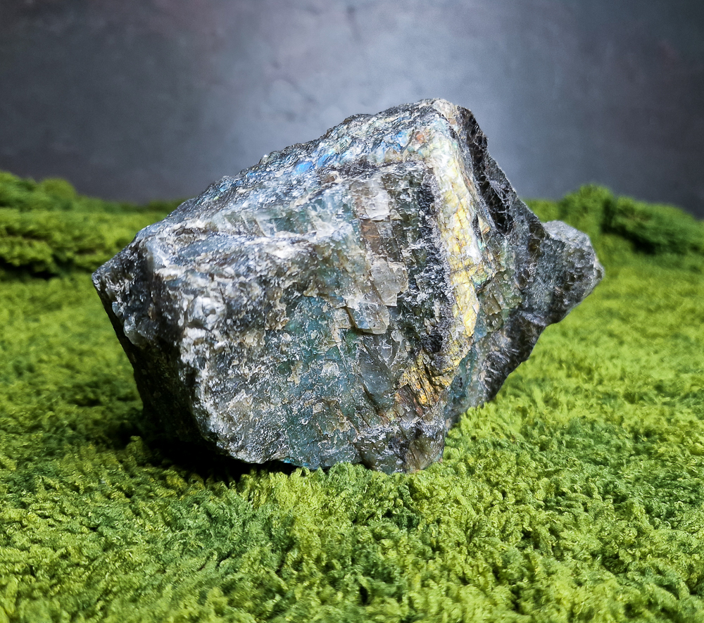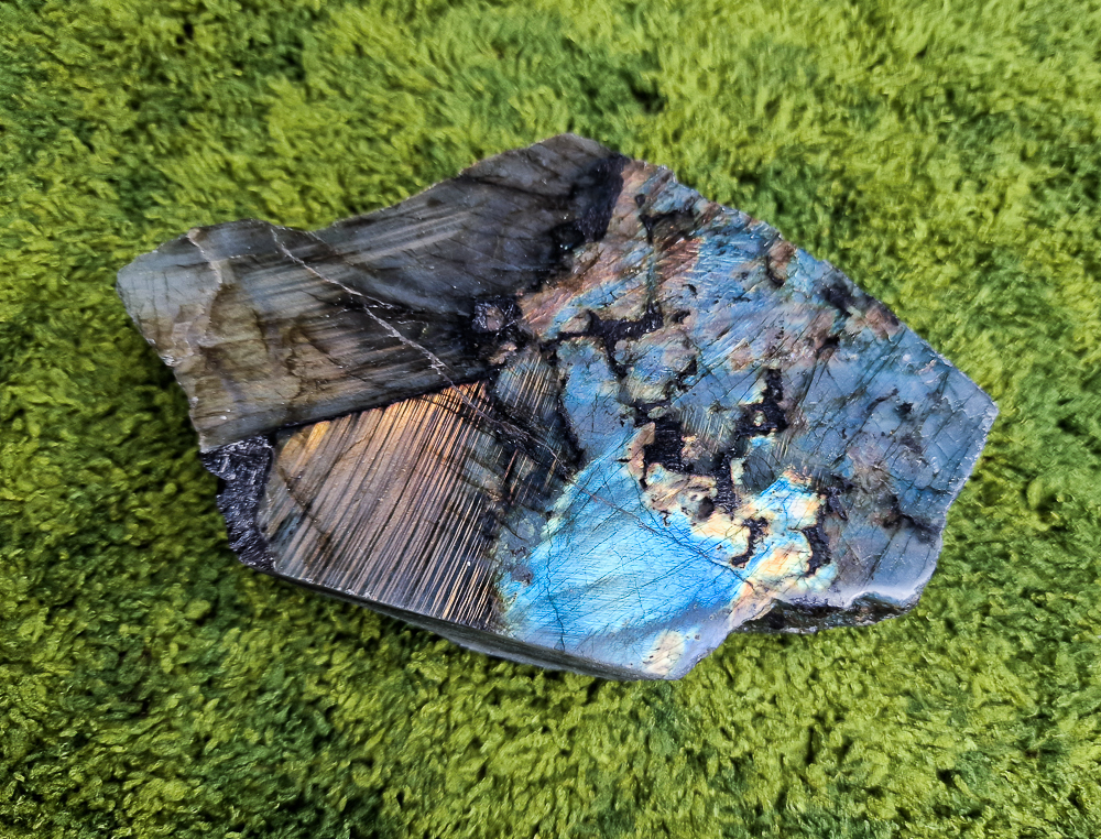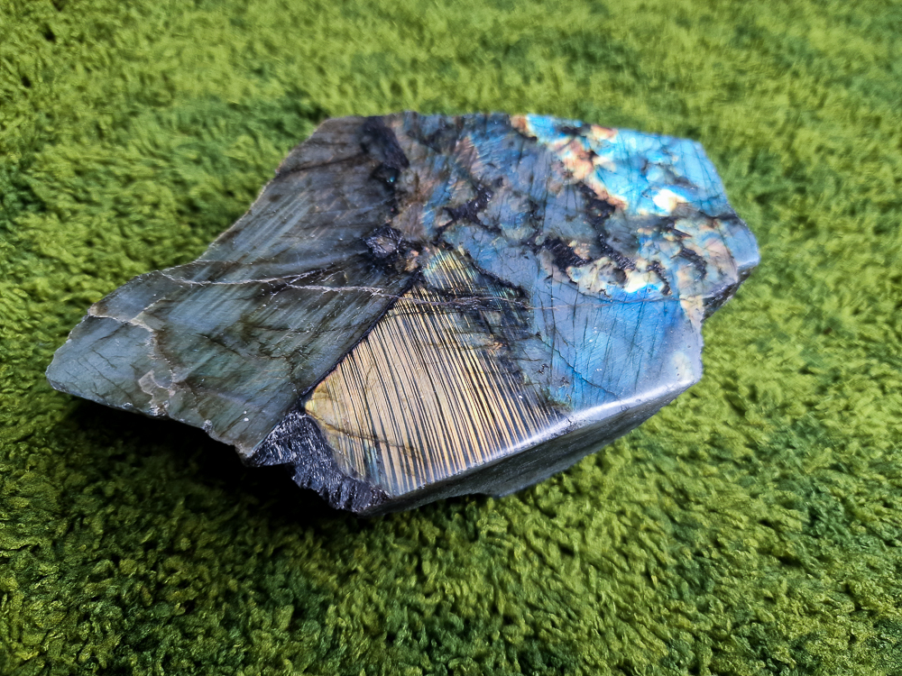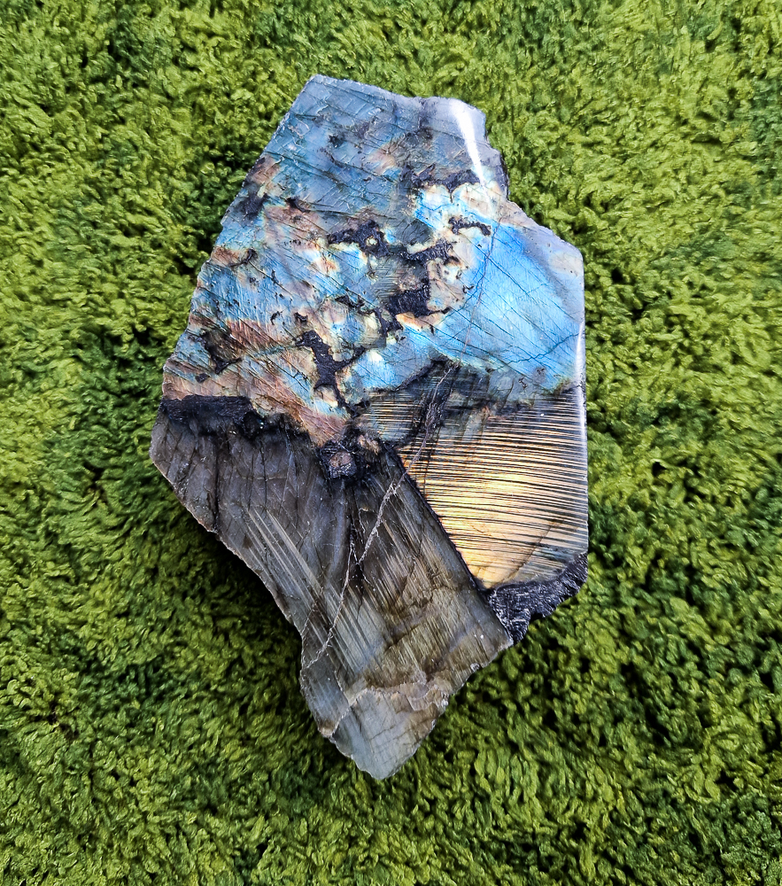 Wyjątkowy labradoryt jednostronnie oszlifowany, stabilnie stojący.
