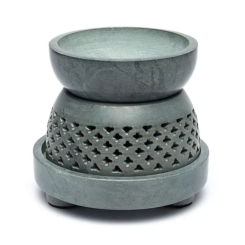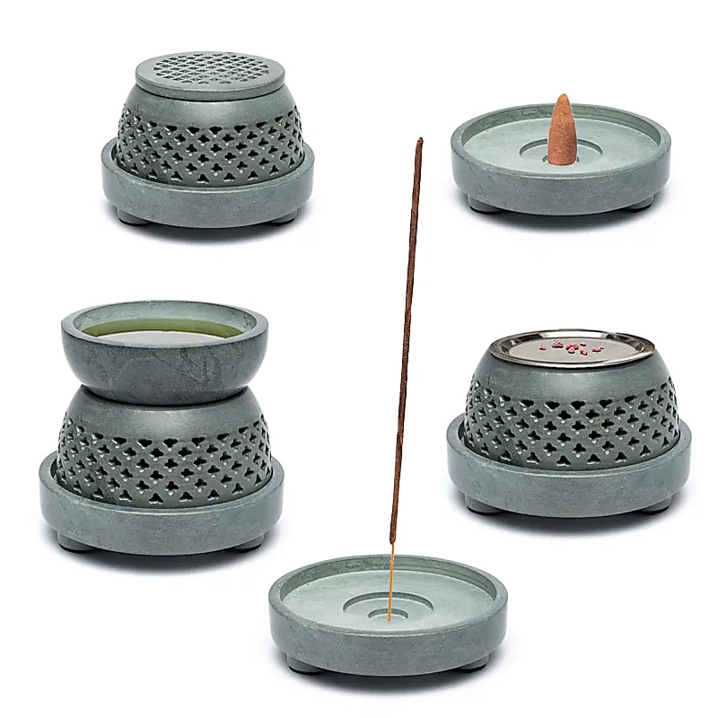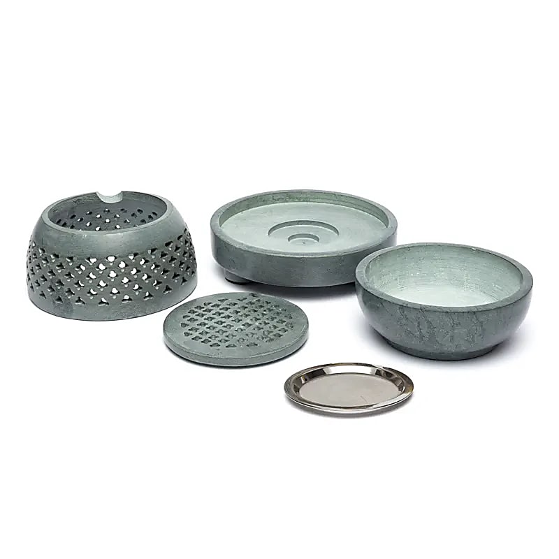 Rzeźbiona, wielofunkcyjna kadzielnica wykonana z naturalnego kamienia – steatytu, wyposażona w metalowy ruszt oraz kamienną miseczkę. To niezwykle uniwersalne akcesorium do pracy z zapachem – sprawdzi się zarówno do palenia naturalnych kadzideł, jak i do podgrzewania wosków zapachowych czy olejków.